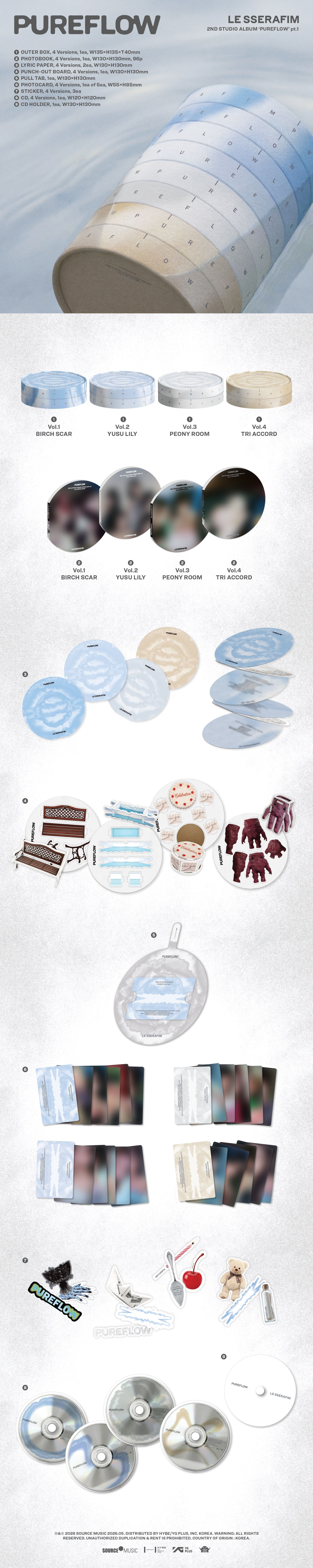 Entering a POWERFUL new phase, LE SSERAFIM (KIM CHAEWON, SAKURA, HUH YUNJIN, KAZUHA & HONG EUNCHAE) returns with their 2nd Studio Album ‘PUREFLOW’ pt.1, available in four different versions. Contents include: Outer Box, Photobook (96pg), CD, CD Holder, Lyric Paper, Punch-out Board (1ea), Pull Tab (1ea), Photocard (1 of 5), Sticker (3ea), US/EU Retail Exclusive: Photocard. Dimensions: 135 x 135 x 40 mm.